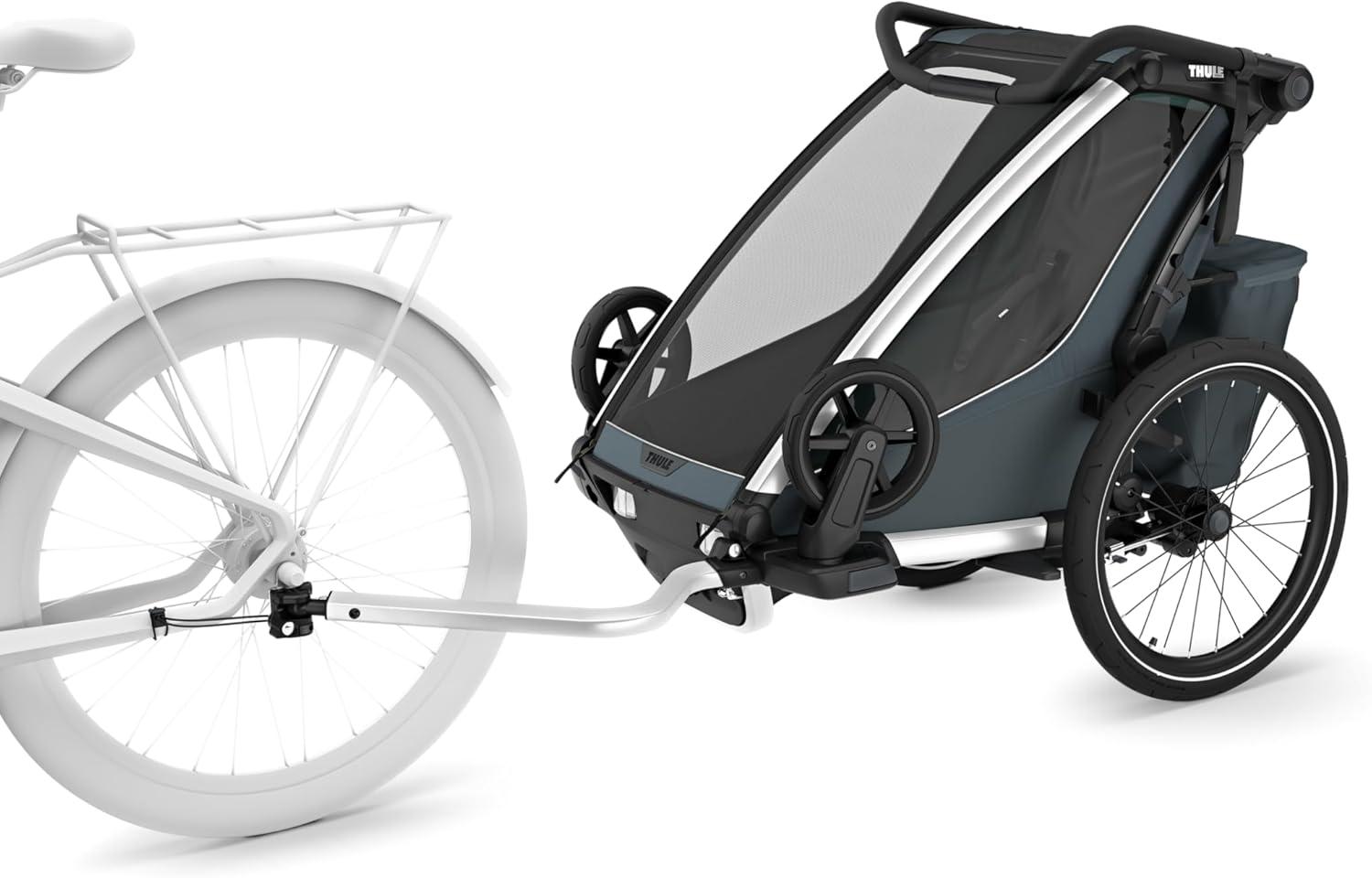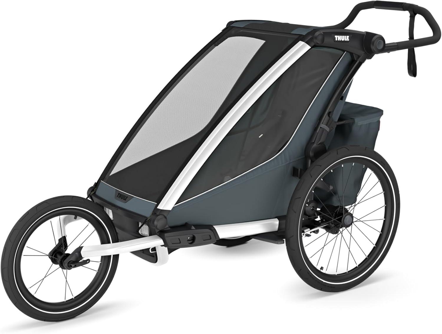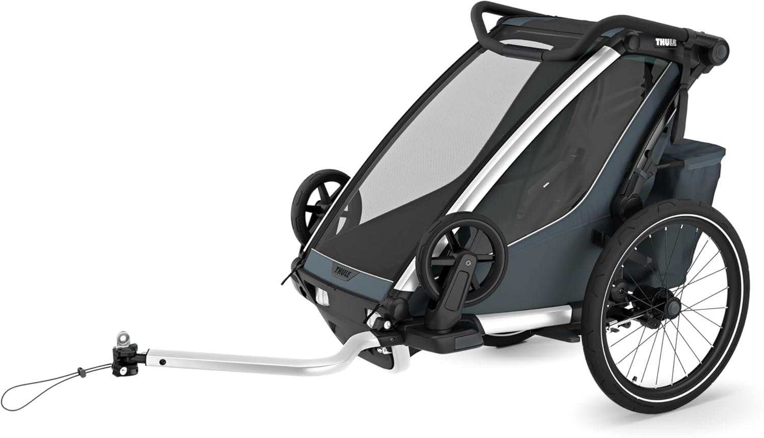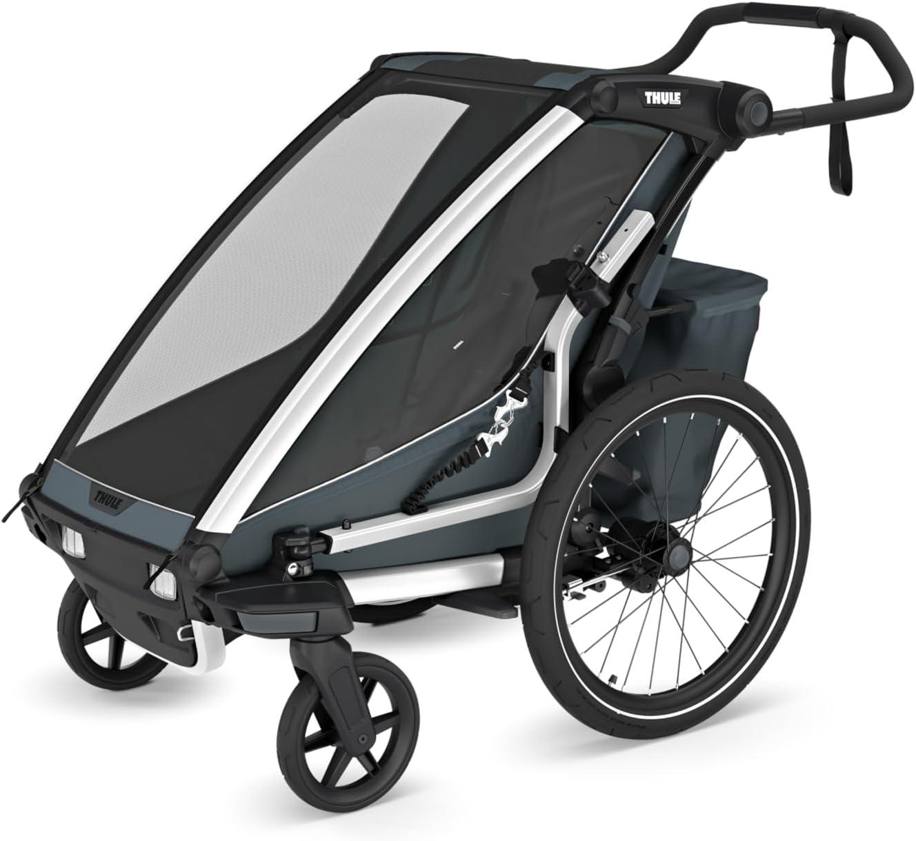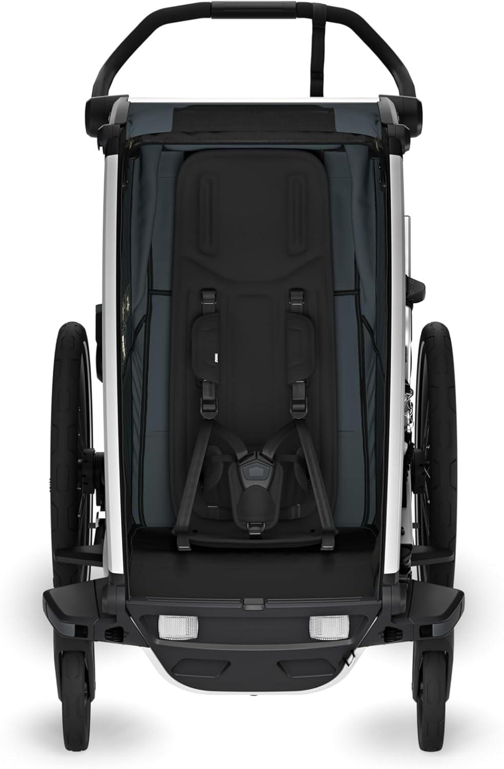 The modular seating ability means that you can choose to have one kid sitting in the middle, or two kids on either side of the trailer. Convenient one-hand recline and fully padded seats for on the go naps