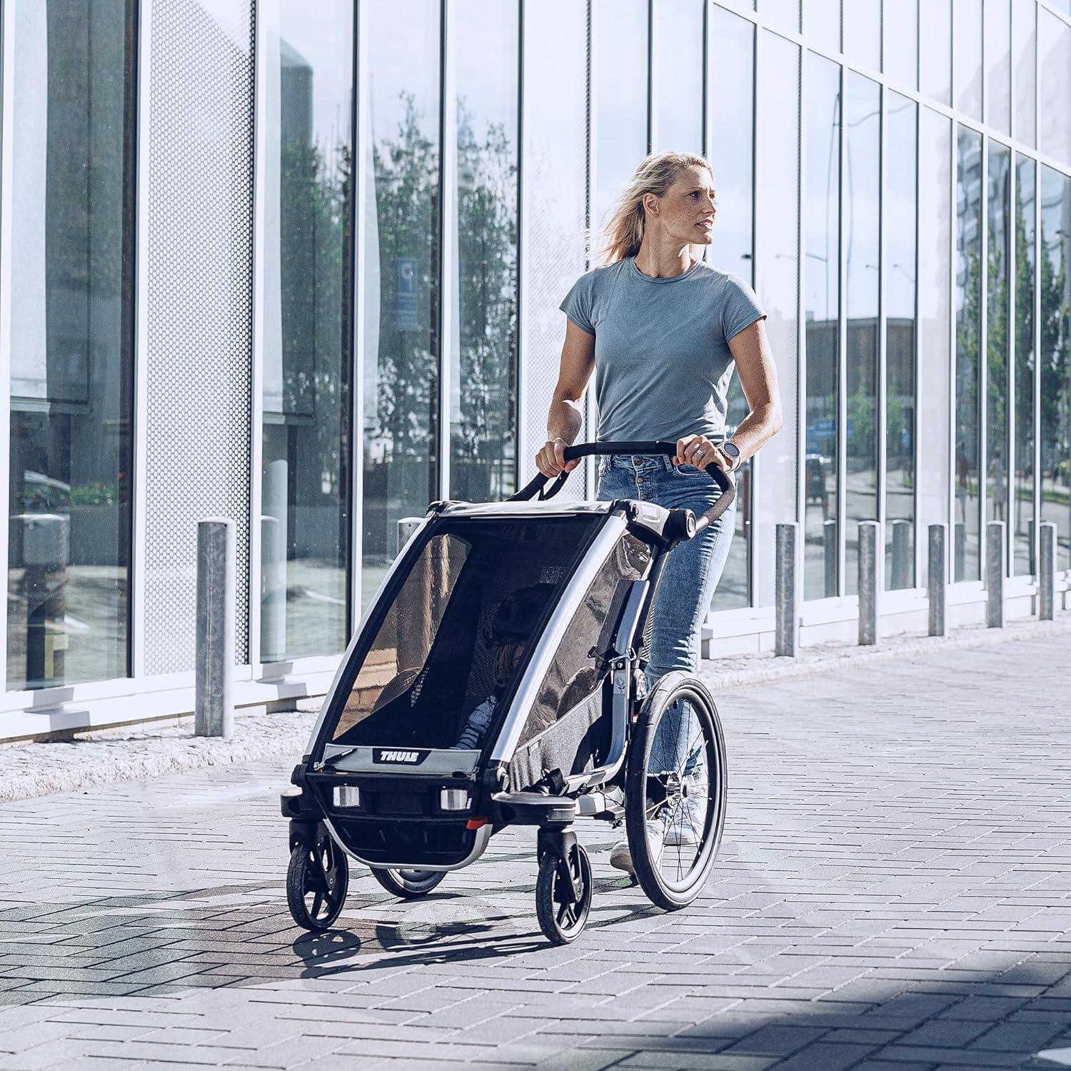 Enjoy strolling, biking, jogging or cross-country skiing as a family with the Thule Chariot Lite. This easy to use multi-sport stroller and trailer spans four seasons and four activities. Use as an everyday stroller or easily transition to a bike trailer for family rides (both kits included). The all-terrain stroller also transitions into a jogging stroller and a ski pulk for cross-country skiing adventures (kits sold separately). Adjustable suspension, a comfortable seat and ventilation vents for circulation provide a comfortable ride for your child on any outing and in any climate. The oversized wheels easily glide over any terrain and the unique compact fold make this bicycle trailer easy to transport and store.