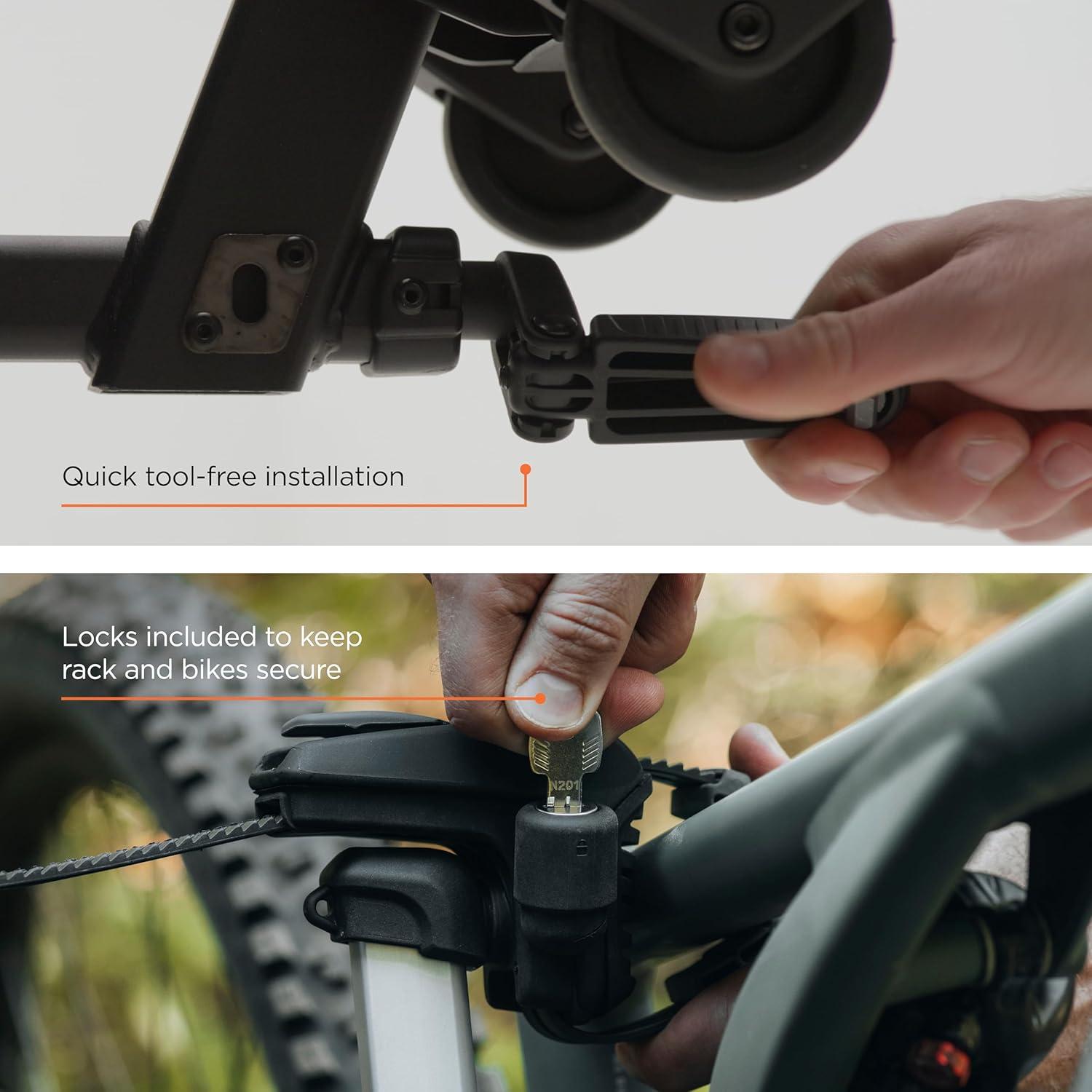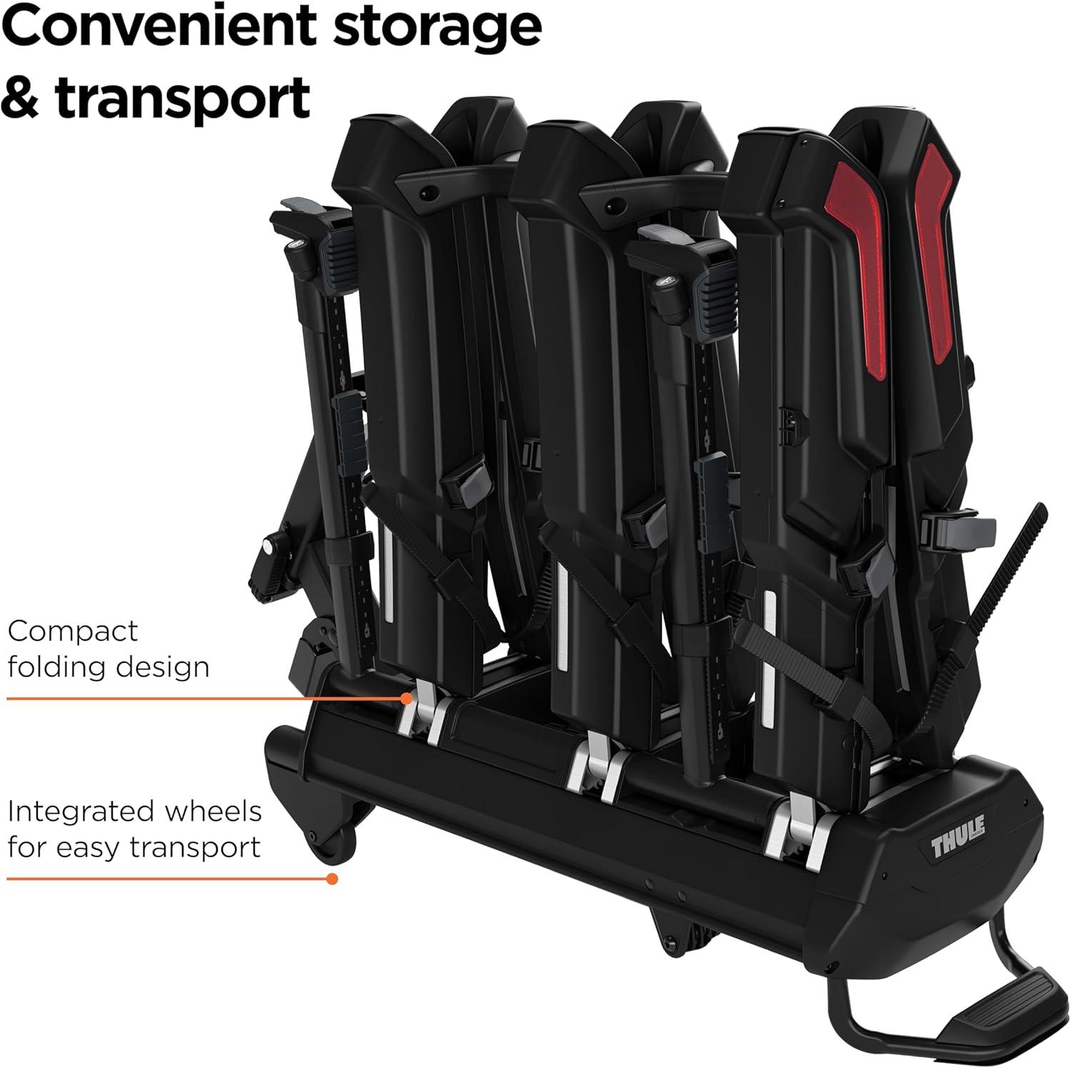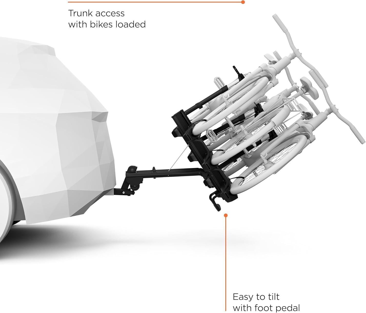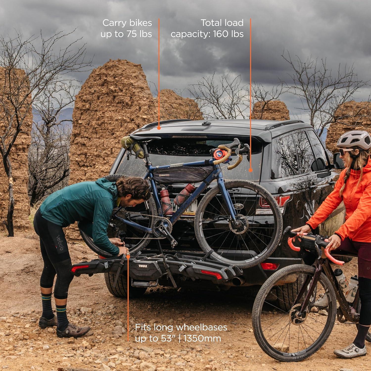 Thule Epos bike rack fits all types of bikes and is fast, easy and convenient to use – it takes minimal effort to mount bikes thanks to an innovative telescopic bike attachment system. The bike arms simply let you attach your bike anywhere on the frame or the rear wheel, providing you with numerous attachment options. You can load and unload up to two bikes in any order – all types of frames and geometries are supported, including ebikes, mountain bikes, gravel bikes, and bikes with fenders and racks.