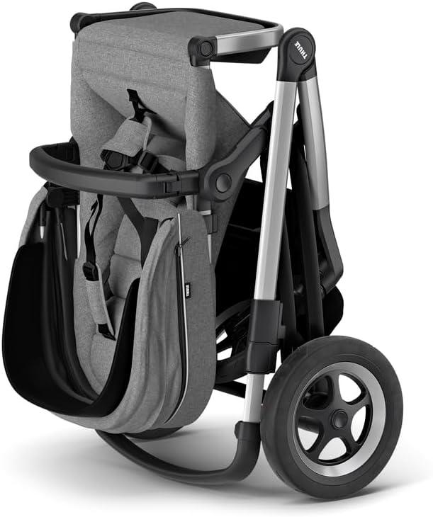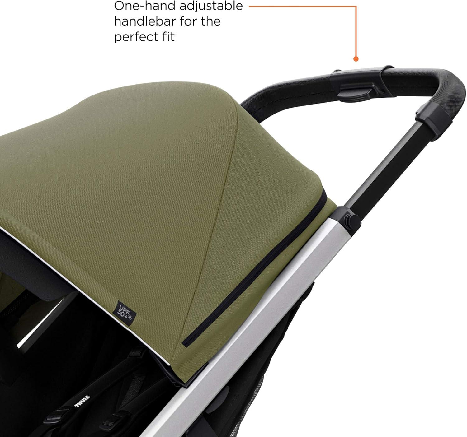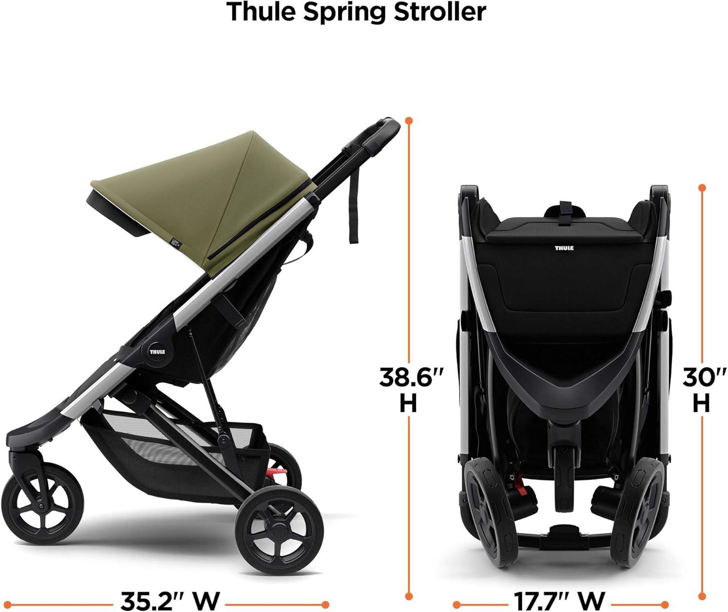 Meet the world with your child using the Thule Spring – a lightweight and compact stroller made for motion. This 3 wheel stroller allows you to easily navigate narrow urban streets, shop for groceries or meet up with friends. Designed with an easy one-hand fold to quickly close even when carrying a child. Thule Spring is 30% smaller than traditional 3 wheel strollers, and it's unique 3D compact fold and self-standing capability make it easy to carry, transport and store when not in use. This single stroller comes with all of the safety feature you expect from Thule. The reclining seat with a 5-point harness provides safety and comfort for strolling and napping on the go. No puncture, foam filled tires provide a smooth ride on any terrain. The swiveling front wheel with suspension can be locked into a fixed position for a comfortable ride anywhere. The vented canopy is fully adjustable and extends for low sun coverage, while also providing UPF 50+ UV protection for your little one. The sliding handlebar adjusts with one hand for ultimate comfort. Finally, the Thule Spring is compliant with Walt Disney Theme park regulations, making it the perfect travel stroller for any family vacation.
