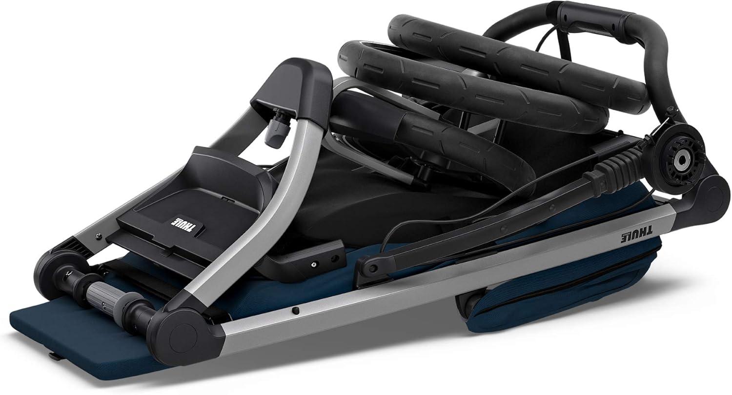 The Thule Urban Glide 2 is the perfect all terrain stroller for the active family. Whether you’re looking for a jogging stroller to take on your favorite path or a full size stroller to easily navigate throughout town, the Thule Urban Glide 2 delivers. Designed with a comfortable seat, a padded 5-point safety harness, and a multi-position canopy with ventilation, your precious cargo is sure to enjoy the ride. The silent, one-handed recline is perfect for naps on the go. This three wheel stroller provides an ultra smooth ride thanks to the large 16″ rear wheels and suspension system. The front swivel wheel makes it easy to maneuver through town and locks into place for jogging. The integrated twist hand brake gives parents control of hilly terrain the adjustable handlebar provides an ergonomic grip for any sized adult. A magnetic peekaboo window allows you to check on your child without disturbing them, even while they sleep. Bring all you need for the day in the large cargo storage bin with a zip-top closure to keep all contents secure, even when folded. Storing and transporting a sport stroller has never been easier thanks to the one-handed compact fold. Simply slide and twist the release bar and the stroller folds in half. Remove the rear tires in seconds to make it even more compact. The Thule Urban Glide 2 can be used as an infant stroller from birth when using car seat adapters (sold separately). It can also transition into a toddler stroller and support a weight capacity of 75 lbs.