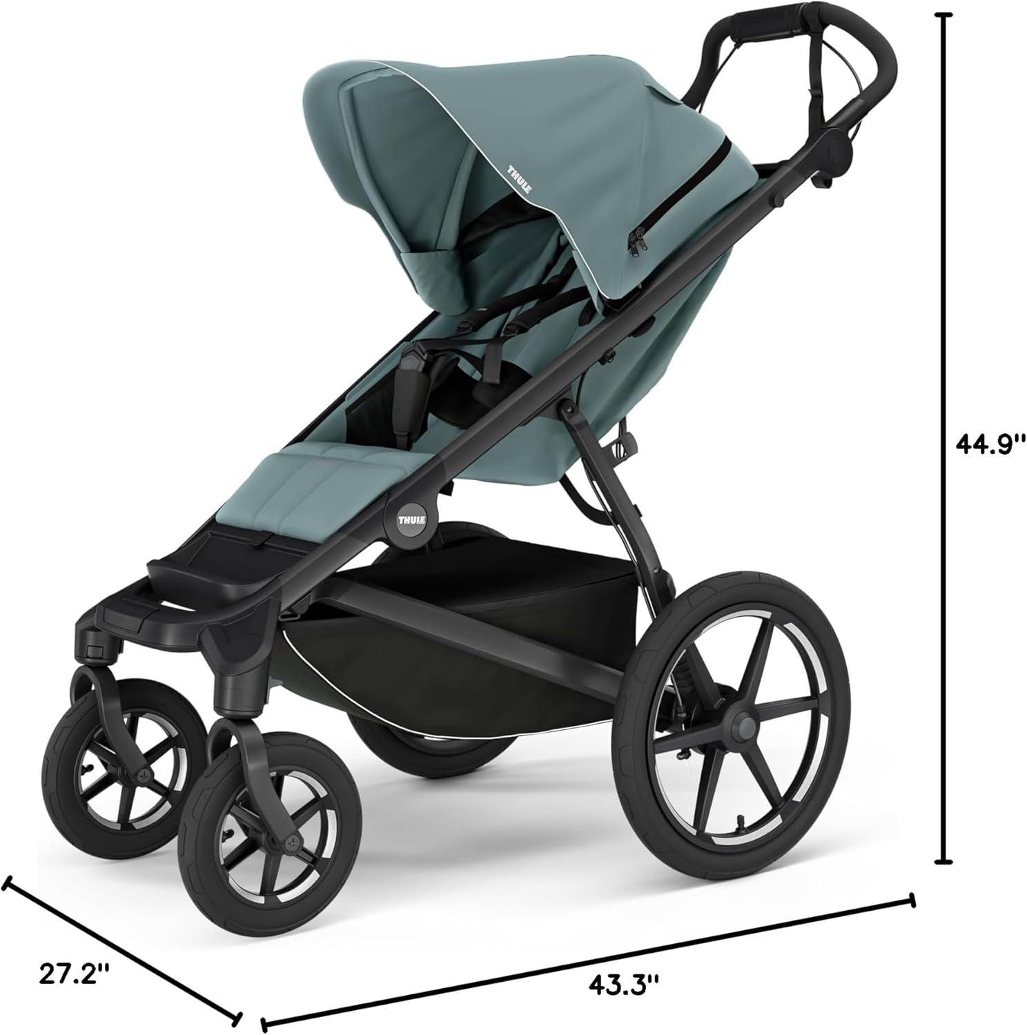 Ultra-smooth ride: This Thule stroller features large 16-inch wheels with air filled tires, suspension and swivel front wheels that locks into place for jogging and running; baby stroller with hand brake for confident speed control